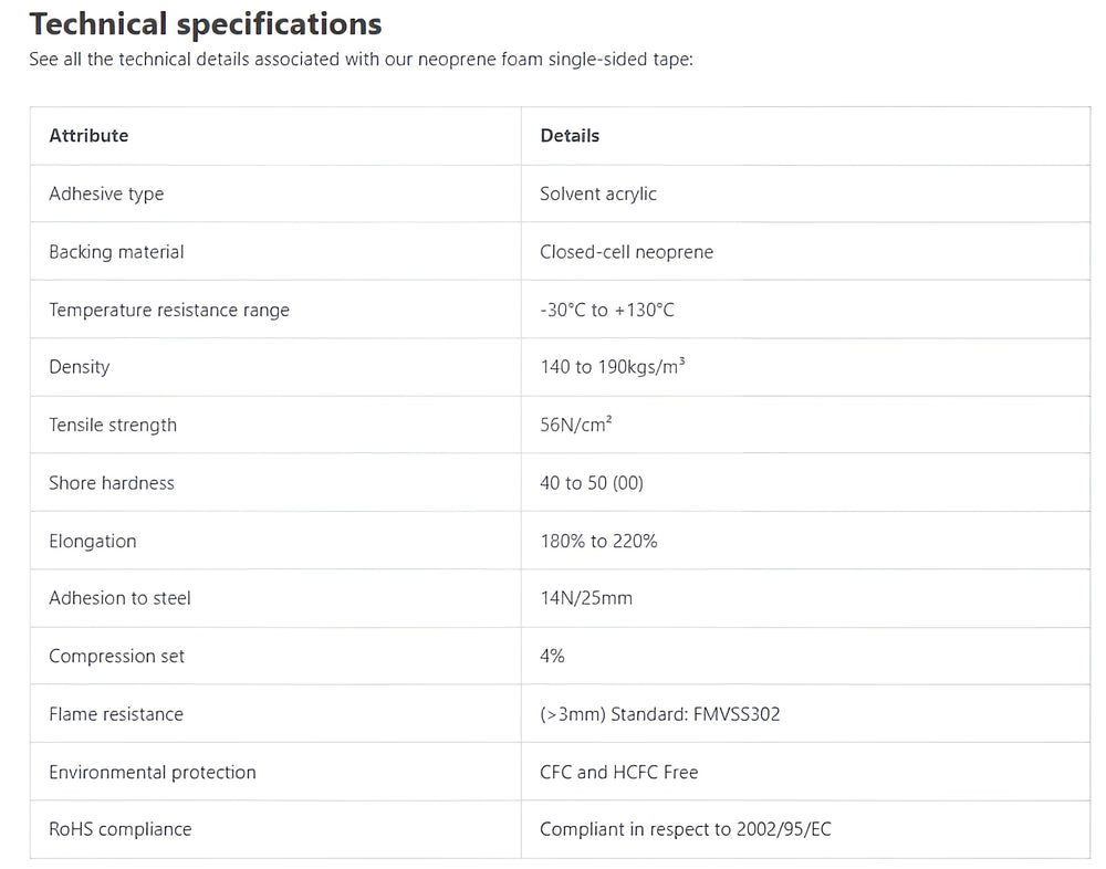 Neoprene Self Adhesive Tape is an expanded Neoprene closed cell rubber foam with an aggressive solvent acrylic adhesive. The foam is oil, weather, heat, & ozone resistant.